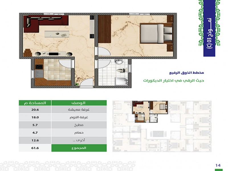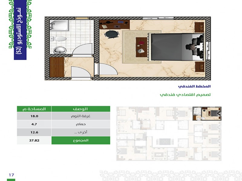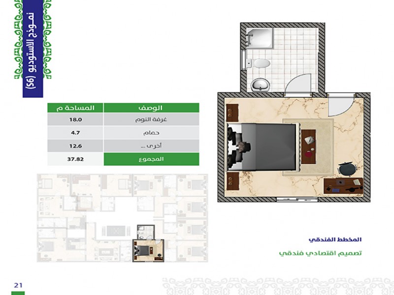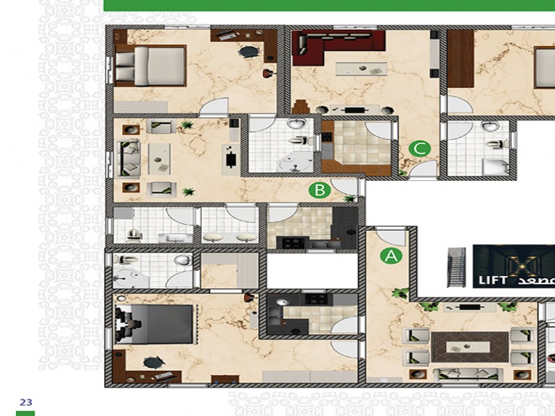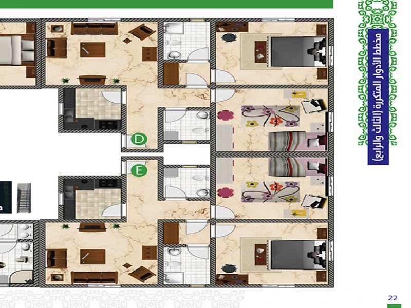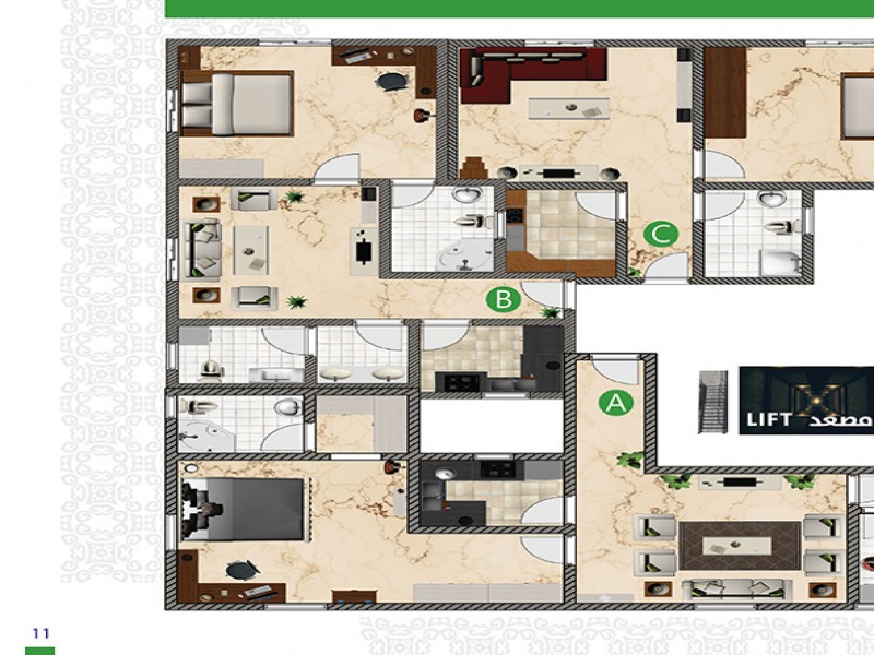(5) أدوار حيث أن هناك خدمات و (3) وحدات سكنية في الأرضي ، ويتكون كل من الدور الاول والثاني من (3) شقق و (6) أستيديوهات و كل من الدور الثالث والرابع من (5) شقق .