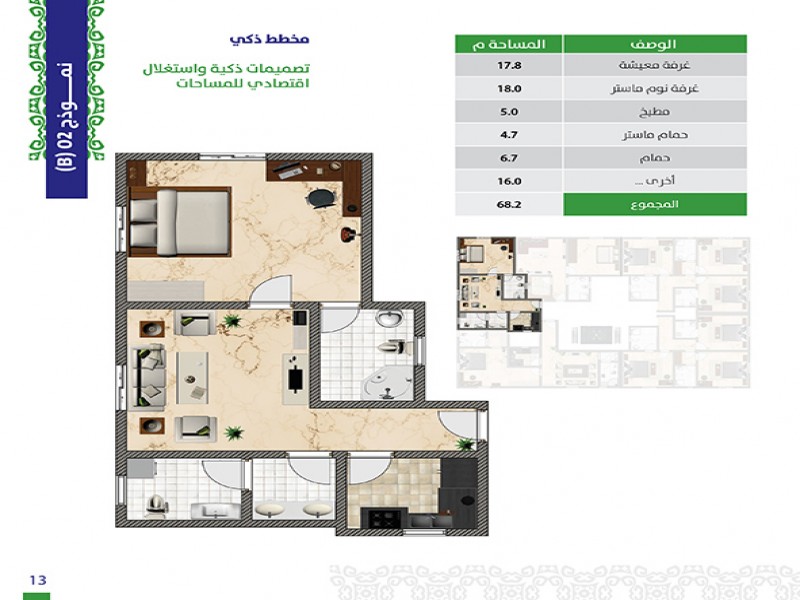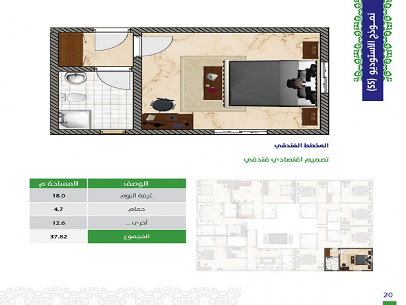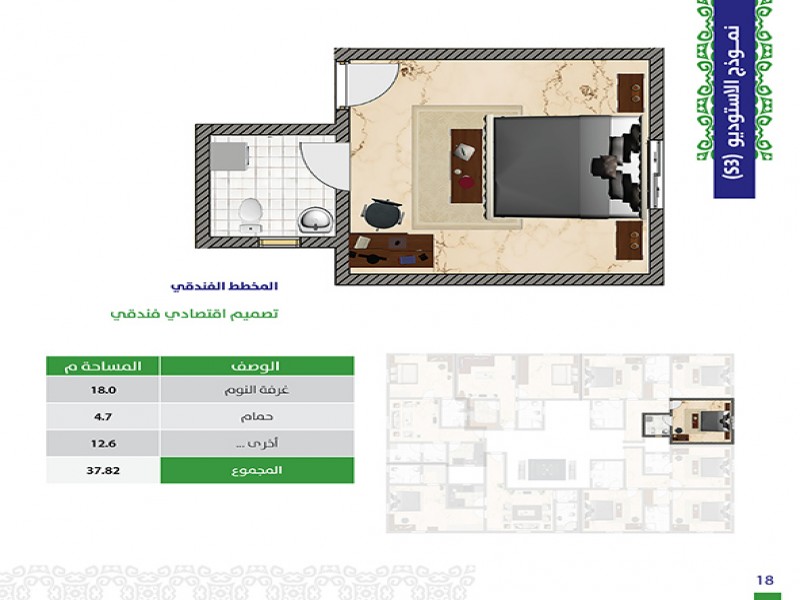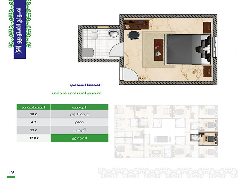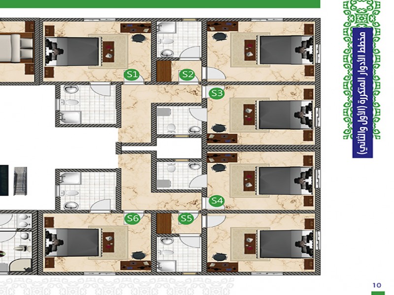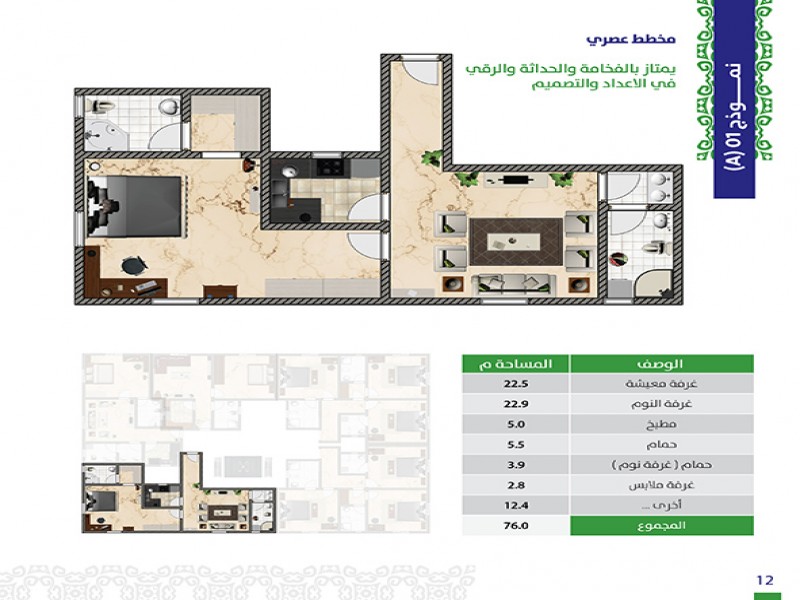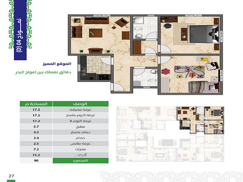 (5) أدوار حيث أن هناك خدمات و (3) وحدات سكنية في الأرضي ، ويتكون كل من الدور الاول والثاني من (3) شقق و (6) أستيديوهات و كل من الدور الثالث والرابع من (5) شقق .